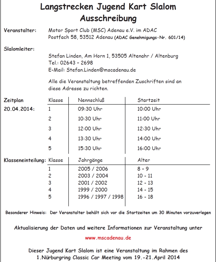 Veranstalter: Motor Sport Club Adenau e. V. im ADAC Postfach 58 53518 Adenau Slalom - Leiter: